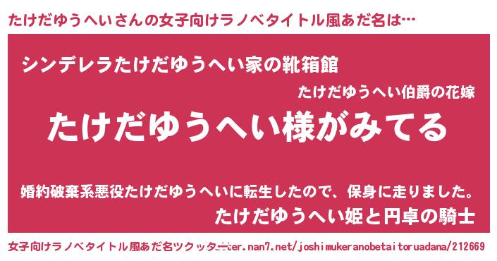 | 男性向けラノベタイトル風あだ名 | 『たけだゆうへいの嫁は女の子じゃないと思った?』 |