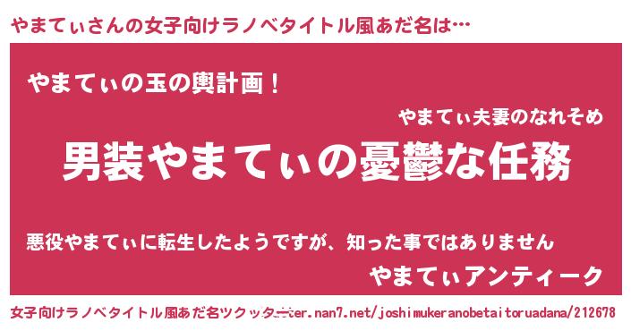 やまてぃさんの女子向けラノベタイトル風あだ名は… 『男装やまてぃの憂鬱な任務』『やまてぃの玉の輿計画!』『やまてぃアンティーク』 ツクッター #女子向けラノベタイトル風あだ名ツクッター http://tkutter.nan7.net/joshimukeranobetaitoruadana/212678/