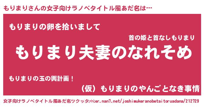 | 男性向けラノベタイトル風あだ名 | 『おまえをオタクにしてやるから、俺をもりまりにしてくれ! 』 |