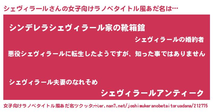 | 男性向けラノベタイトル風あだ名 | 『この素晴らしい世界にシェヴィラールを!』 |