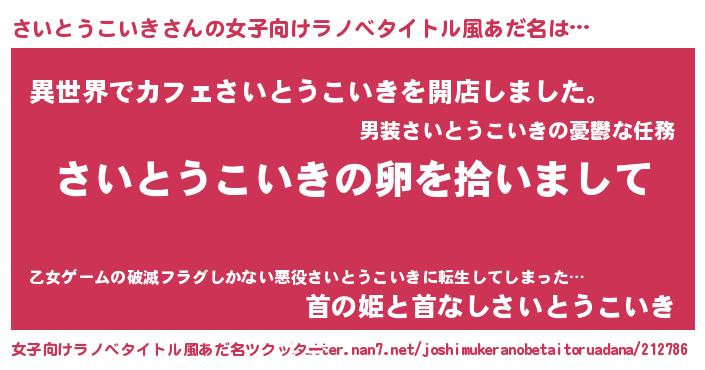 | 男性向けラノベタイトル風あだ名 | 『さいとうこいきの嫁は女の子じゃないと思った?』 |