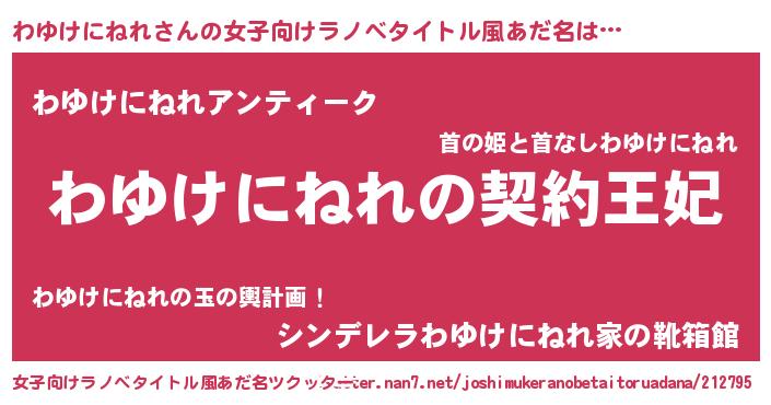 | 男性向けラノベタイトル風あだ名 | 『わゆけにねれという概念が存在しない退屈な世界 』 |