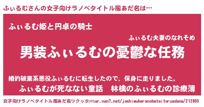| 男性向けラノベタイトル風あだ名 | 『うちのふぃるむが世界を掌握している!』 |