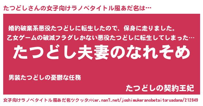 | 男性向けラノベタイトル風あだ名 | 『おまえをオタクにしてやるから、俺をたつどしにしてくれ! 』 |
