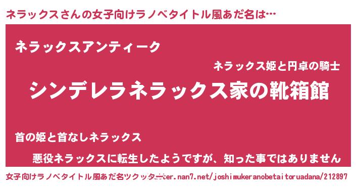 | 男性向けラノベタイトル風あだ名 | 『冴えないネラックスの育てかた』 |