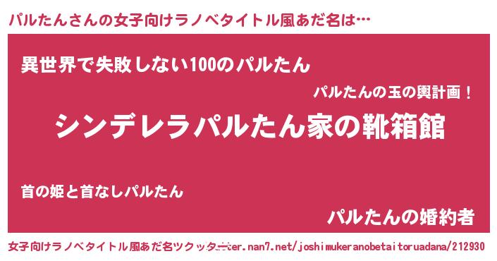 パルたんさんの女子向けラノベタイトル風あだ名は… 『シンデレラパルたん家の靴箱館』『異世界で失敗しない100のパルたん』『パルたんの婚約者』 ツクッター #女子向けラノベタイトル風あだ名ツクッター http://tkutter.nan7.net/joshimukeranobetaitoruadana/212930/