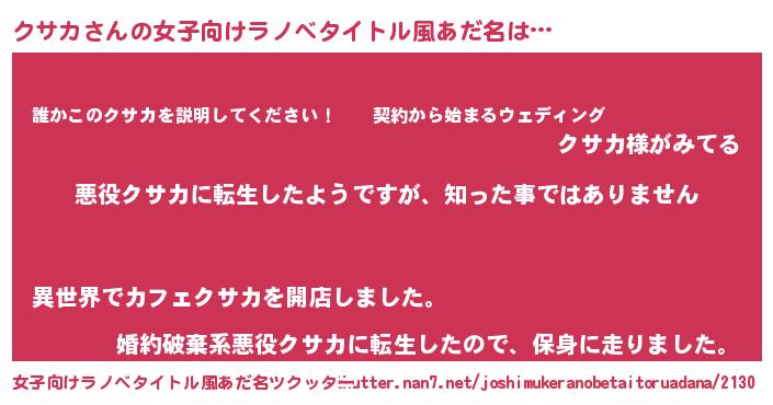 | 男性向けラノベタイトル風あだ名 | 『この素晴らしい世界にクサカを!』 |