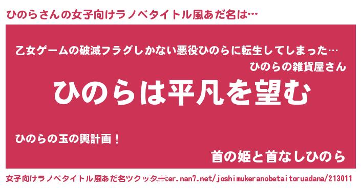 | 男性向けラノベタイトル風あだ名 | 『ダンジョンにひのらを求めるのは間違っているだろうか』 |