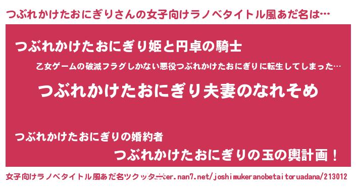 | 男性向けラノベタイトル風あだ名 | 『おまえをオタクにしてやるから、俺をつぶれかけたおにぎりにしてくれ! 』 |