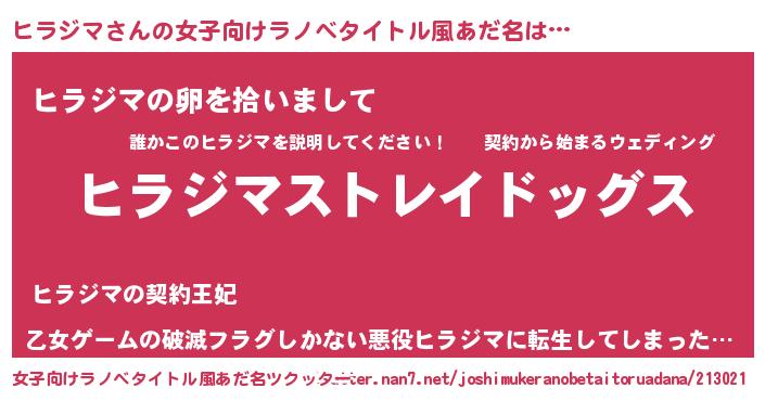 ヒラジマさんの女子向けラノベタイトル風あだ名は… 『ヒラジマストレイドッグス』『ヒラジマの卵を拾いまして』『乙女ゲームの破滅フラグしかない悪役ヒラジマに転生してしまった…』 ツクッター #女子向けラノベタイトル風あだ名ツクッター http://tkutter.nan7.net/joshimukeranobetaitoruadana/213021/