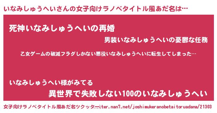 | 男性向けラノベタイトル風あだ名 | 『この素晴らしい世界にいなみしゅうへいを!』 |