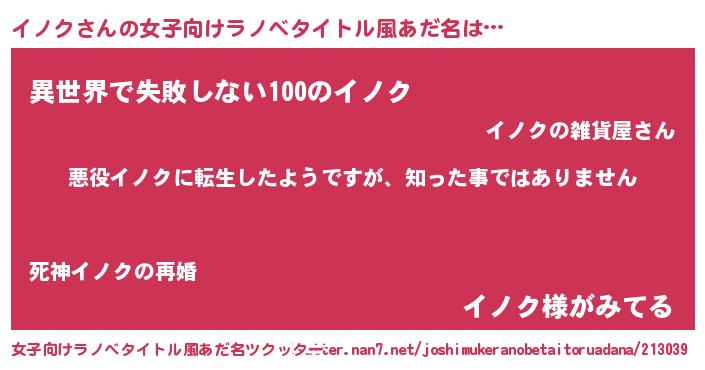 | 男性向けラノベタイトル風あだ名 | 『この素晴らしい世界にイノクを!』 |