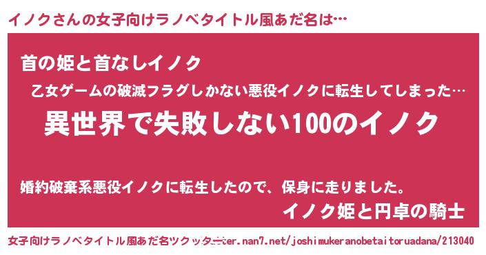 | 男性向けラノベタイトル風あだ名 | 『イノクという概念が存在しない退屈な世界 』 |