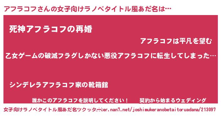 | 男性向けラノベタイトル風あだ名 | 『この素晴らしい世界にアフラコフを!』 |