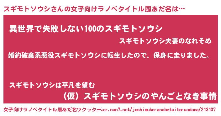 | 胡散臭い通販商品みたいなあだ名 | 『来世でも幸せになれる水素水…その名も「スギモトソウシ」』 |