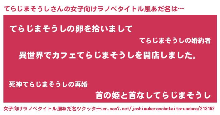 | 男性向けラノベタイトル風あだ名 | 『誰もが恐れるあのてらじまそうしが、ぼくの専属メイドになるようです。』 |