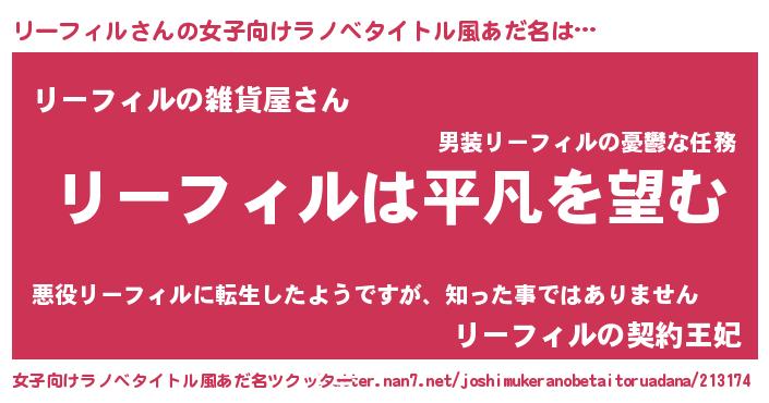 | 男性向けラノベタイトル風あだ名 | 『ダンジョンにリーフィルを求めるのは間違っているだろうか』 |