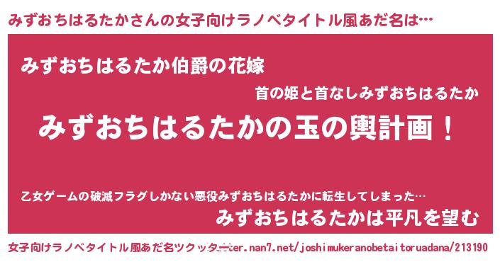 | 男性向けラノベタイトル風あだ名 | 『みずおちはるたか~年齢イコール彼女いない歴の魔法使い~』 |