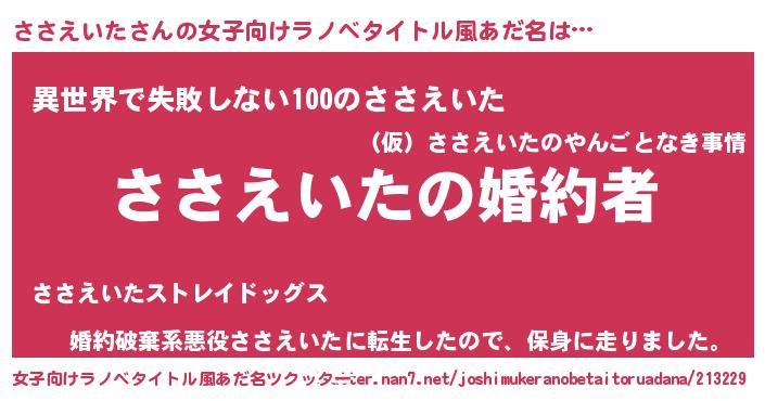 | 男性向けラノベタイトル風あだ名 | 『うちの娘の為ならば、俺はもしかしたらささえいたも倒せるかもしれない。』 |