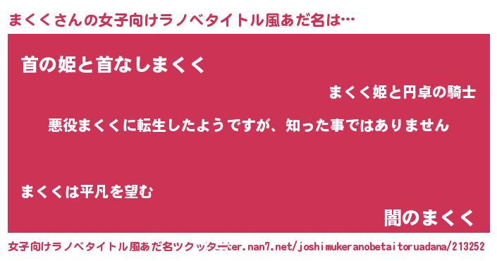 | 男性向けラノベタイトル風あだ名 | 『この素晴らしい世界にまくくを!』 |
