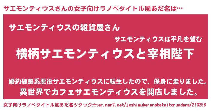 | 男性向けラノベタイトル風あだ名 | 『サエモンティウスに滅ぼされるだけの簡単なお仕事です』 |