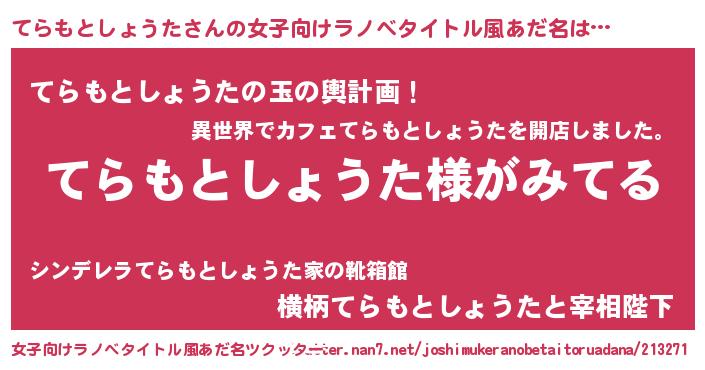 | 男性向けラノベタイトル風あだ名 | 『てらもとしょうたの嫁は女の子じゃないと思った?』 |