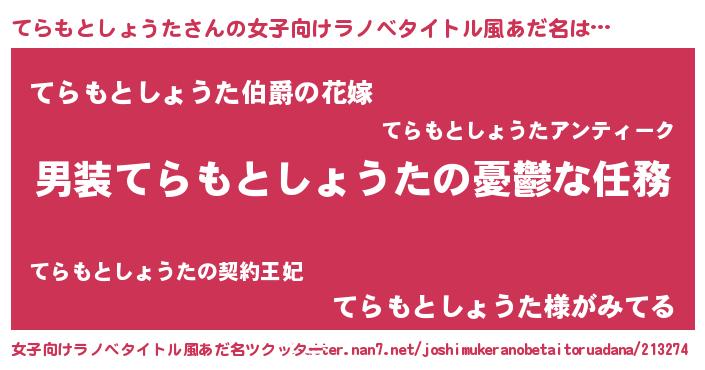 | 男性向けラノベタイトル風あだ名 | 『冴えないてらもとしょうたの育てかた』 |