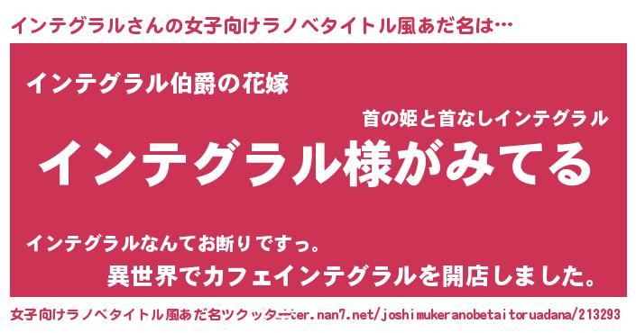 | 男性向けラノベタイトル風あだ名 | 『インテグラルの嫁は女の子じゃないと思った?』 |