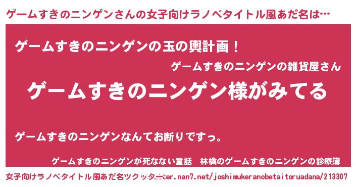 | 男性向けラノベタイトル風あだ名 | 『ゲームすきのニンゲンの嫁は女の子じゃないと思った?』 |