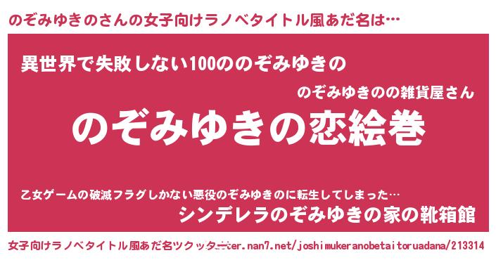 | 男性向けラノベタイトル風あだ名 | 『おまえをオタクにしてやるから、俺をのぞみゆきのにしてくれ! 』 |