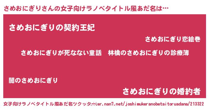 さめおにぎりさんの女子向けラノベタイトル風あだ名は… 『さめおにぎりが死なない童話 林檎のさめおにぎりの診療簿』『さめおにぎりの契約王妃』『さめおにぎりの婚約者』 ツクッター #女子向けラノベタイトル風あだ名ツクッター http://tkutter.nan7.net/joshimukeranobetaitoruadana/213322/
