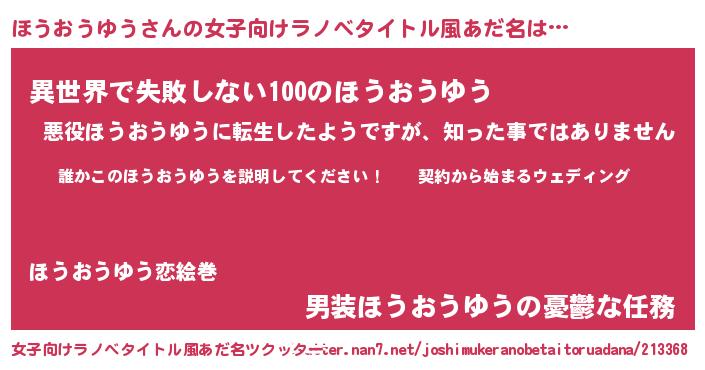 | 男性向けラノベタイトル風あだ名 | 『ホウオウユウアートオンライン』 |