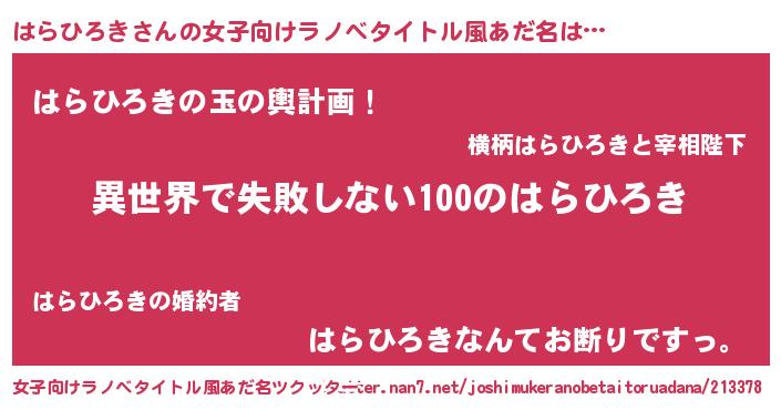 | 男性向けラノベタイトル風あだ名 | 『はらひろきという概念が存在しない退屈な世界 』 |