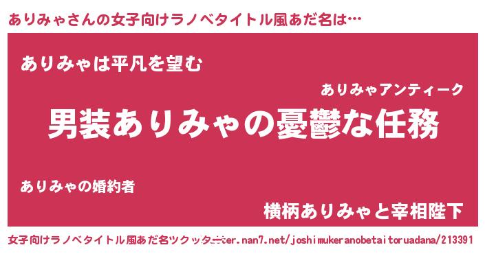 | 男性向けラノベタイトル風あだ名 | 『うちのありみゃが世界を掌握している!』 |