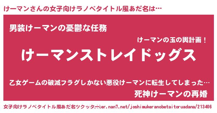 | 男性向けラノベタイトル風あだ名 | 『Re:けーマンから始める異世界生活』 |