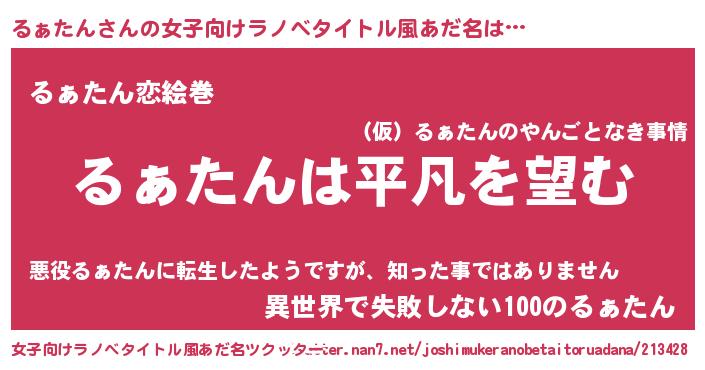 るぁたんさんの女子向けラノベタイトル風あだ名は… 『るぁたんは平凡を望む』『るぁたん恋絵巻』『異世界で失敗しない100のるぁたん』 ツクッター #女子向けラノベタイトル風あだ名ツクッター http://tkutter.nan7.net/joshimukeranobetaitoruadana/213428/