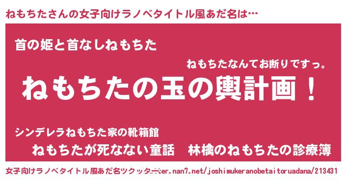 | 男性向けラノベタイトル風あだ名 | 『ねもちた~年齢イコール彼女いない歴の魔法使い~』 |
