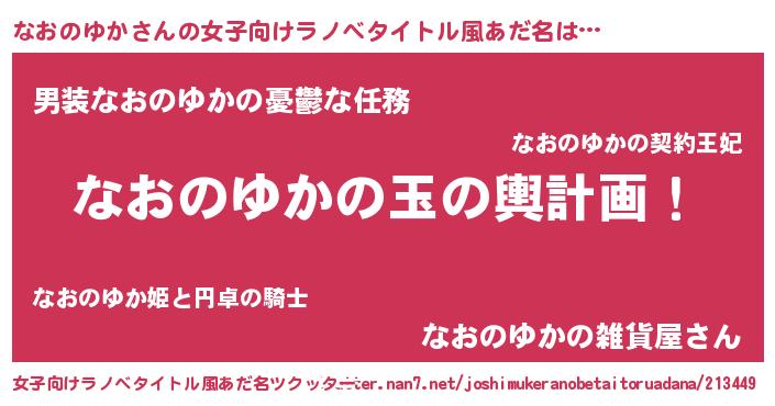| 男性向けラノベタイトル風あだ名 | 『なおのゆか~年齢イコール彼女いない歴の魔法使い~』 |