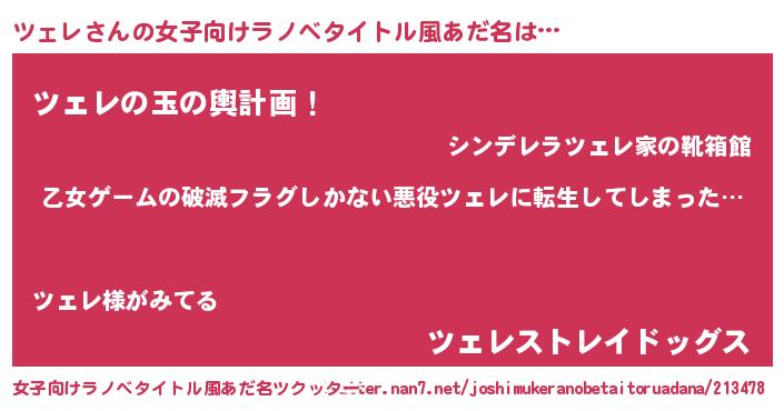 | 男性向けラノベタイトル風あだ名 | 『この素晴らしい世界にツェレを!』 |