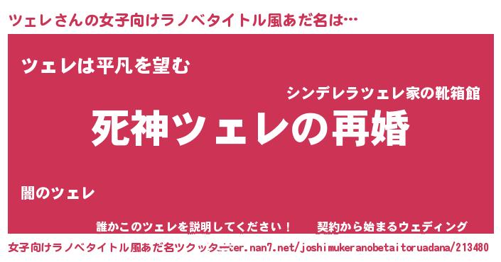 ツェレさんの女子向けラノベタイトル風あだ名は… 『死神ツェレの再婚』『ツェレは平凡を望む』『誰かこのツェレを説明してください! ~契約から始まるウェディング~』 ツクッター #女子向けラノベタイトル風あだ名ツクッター http://tkutter.nan7.net/joshimukeranobetaitoruadana/213480/