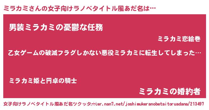 | 男性向けラノベタイトル風あだ名 | 『魔弾の王とミラカミ』 |
