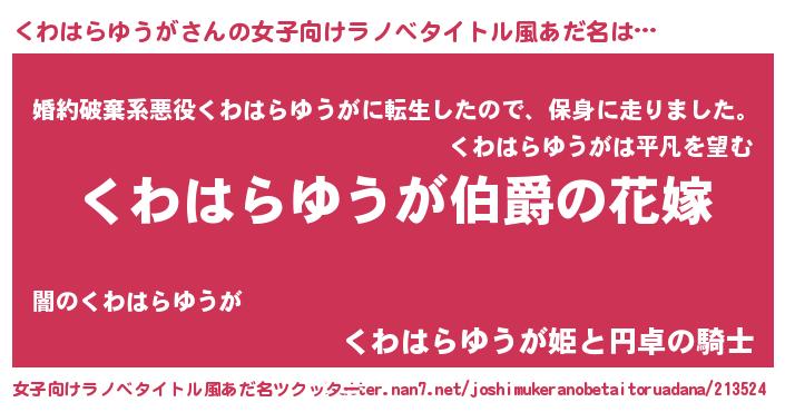 | 男性向けラノベタイトル風あだ名 | 『うちの娘の為ならば、俺はもしかしたらくわはらゆうがも倒せるかもしれない。』 |