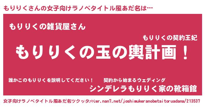 | 男性向けラノベタイトル風あだ名 | 『もりりく~年齢イコール彼女いない歴の魔法使い~』 |