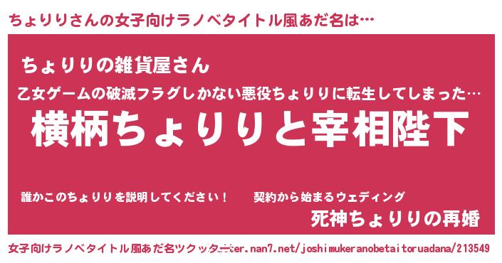| 男性向けラノベタイトル風あだ名 | 『ちょりりに滅ぼされるだけの簡単なお仕事です』 |