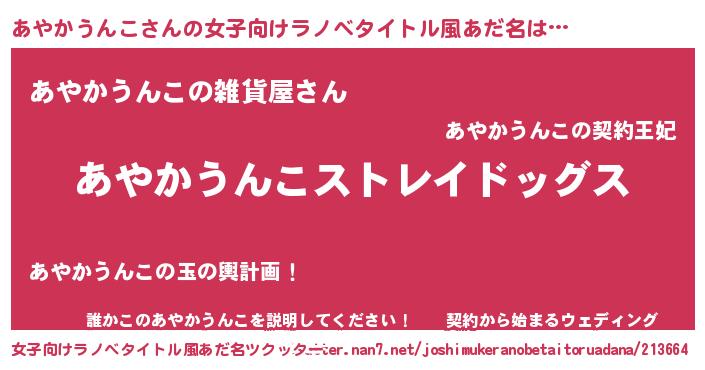 | 男性向けラノベタイトル風あだ名 | 『Re:あやかうんこから始める異世界生活』 |