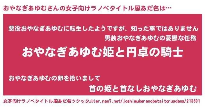 | 男性向けラノベタイトル風あだ名 | 『オヤナギアユムアートオンライン』 |