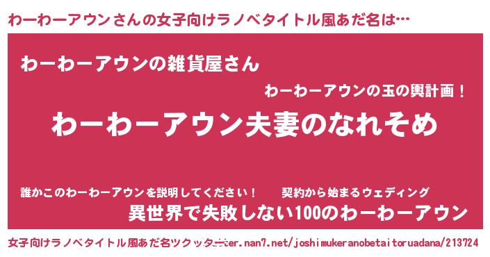 | 男性向けラノベタイトル風あだ名 | 『おまえをオタクにしてやるから、俺をわーわーアウンにしてくれ! 』 |