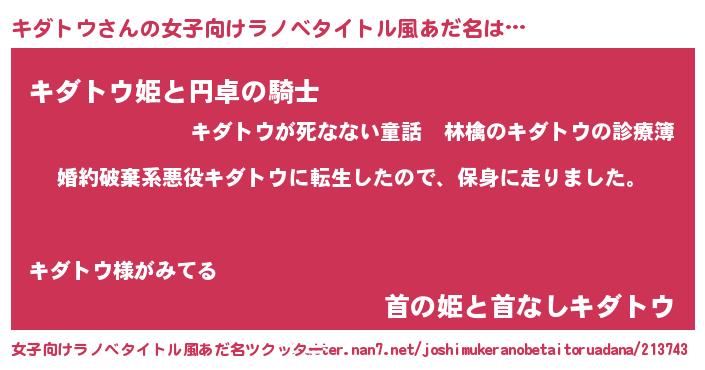 | 男性向けラノベタイトル風あだ名 | 『キダトウスレイヤー』『キダトウの憂鬱』 |