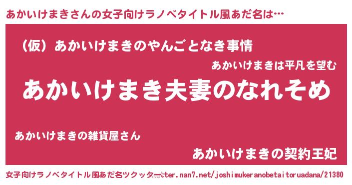 | 男性向けラノベタイトル風あだ名 | 『おまえをオタクにしてやるから、俺をあかいけまきにしてくれ! 』 |