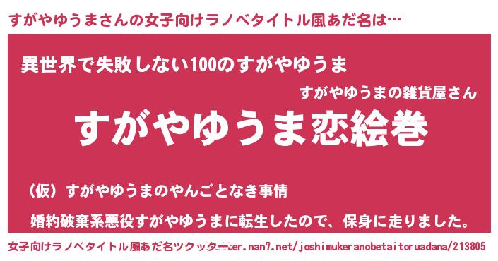 | 男性向けラノベタイトル風あだ名 | 『おまえをオタクにしてやるから、俺をすがやゆうまにしてくれ! 』 |